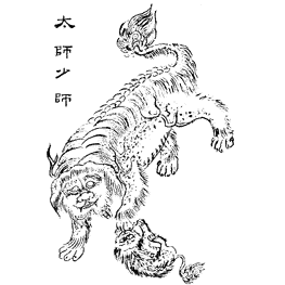 下 是 一 個 幼 仔 。 獅 子 頭 上 的 凸 塊 按 照 它 所 守 衛 的 主 人 官 階 而 定 。 左 邊 的 獅 子 代 表 「 太 師 」 ,